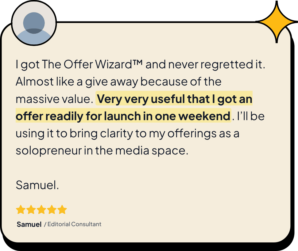 Been there. Done that. Got the t-shirt (and pants, hat, gloves and socks). Sam didn’t chase the mythical place of perfection. He plugged into The Offer Wizard™, followed the prompts, and came out the other side with an offer that was ready to hit the market by Monday morning. He plans to use The Offer Wizard™ to refine all future offers. The lesson is all this? You don’t need to spend weeks (or MONTHS), 13 Redbulls, and yelling obscenities at the neighbors trying to perfect it. The Offer Wizard™ walks you step-by-step through the process of naming, pricing, and packaging your knowledge into a simple, scalable product. Guesswork? We don’t know him. Greedy Guru fluff? NOPE! This is a tool built for Creators who desire the “Every Day Pay Day” lifestyle. I’m re-launching it this week. YOU GOT THIS 🙌 In your corner, When you’re ready, here are a couple of ways I can help you…