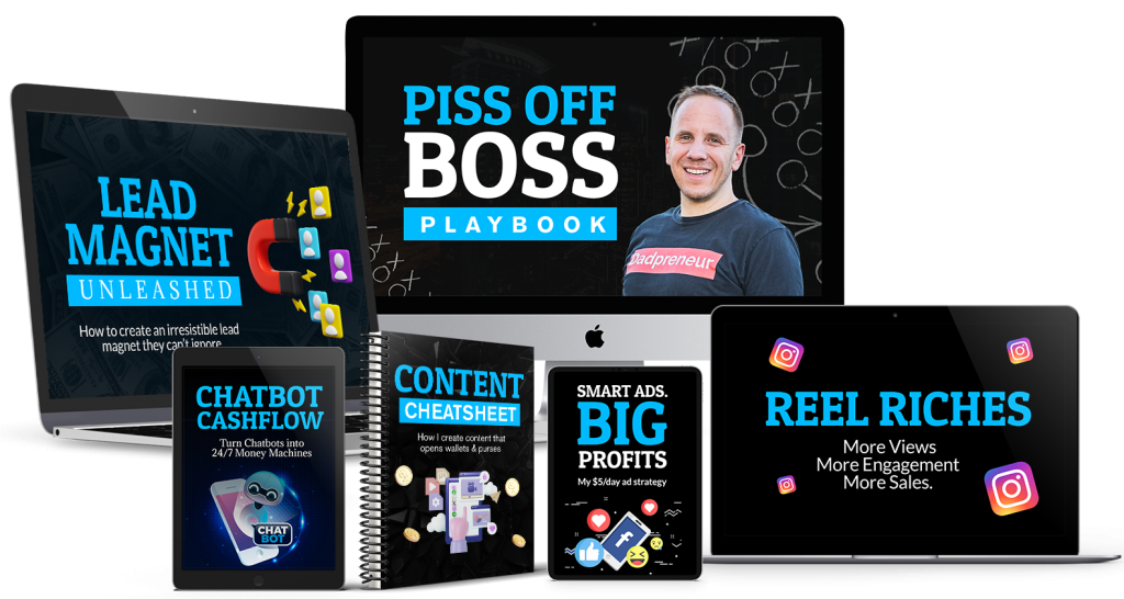 - Piss Off Boss Playbook - 502 customers in one month—without high-pressure sales or burnout. This guide breaks down my step-by-step strategy using low-stress PDFs, passive funnels, and low-cost ads to create a system that stacks sales on autopilot.