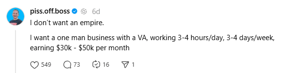 I made a post on Threads a few weeks back. I was surprised how much it resonated with people. So I posted it again last week: Hint: You need to radically repeat yourself, if you want your message to stick. There’s a lot of people online who are shouting their face off to “scale” their business. Big teams. DM setters & closers. Some have fancy offices, or a fleet of Lambos in the driveway. No, thank you. I’m not after an empire. I’m building what I shared in the screenshot above. I ain’t after “empire money” (and empire problems). I want “freedom money”. The kind of money that buys your time back. The kind that lets you pick your son up from school at 3:11 every day. The kid that allows you to take multiple walks throughout the day (I averaged 13,305 steps/day in August) Many sell the dream of “scale”. Scale, to me, = More stress. At 44, I have zero interest in that. I like lean. Simple offers. Simple systems. Simple sales. ’round here we call it the “3 Hour Creator” way. It ain’t for everyone. It’s for the ones who are called to design a life they don’t a vacation from. YOU GOT THIS In your corner,